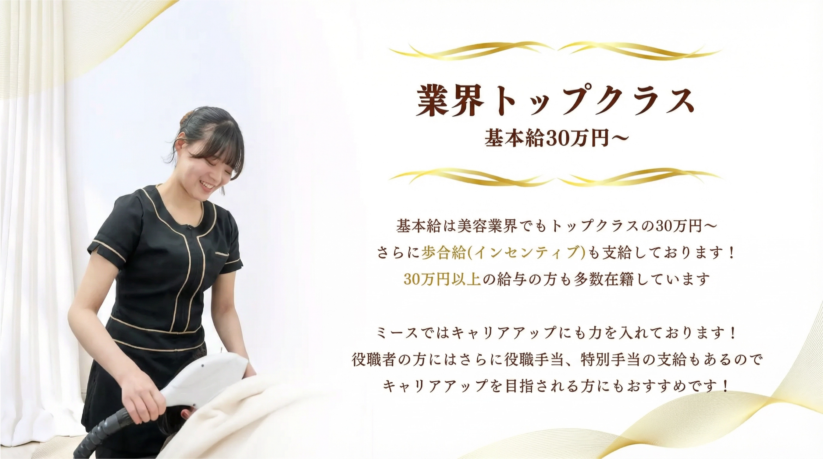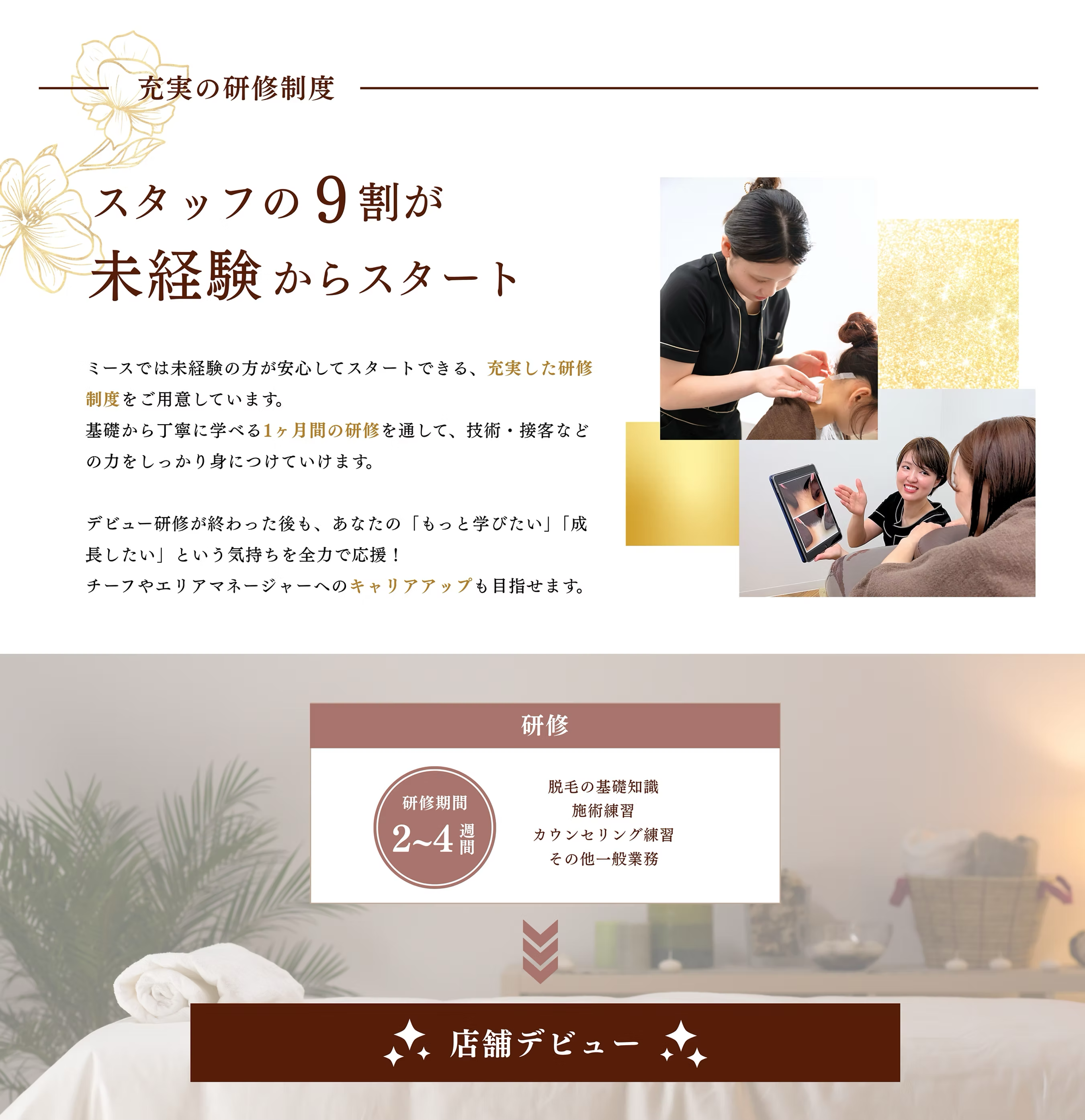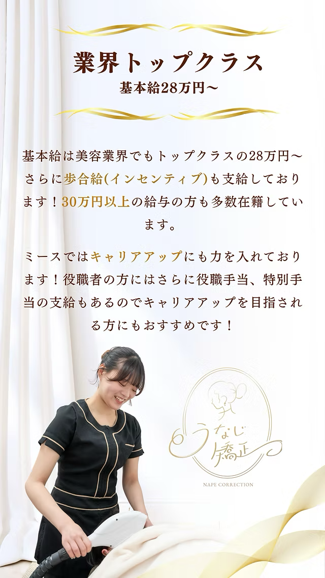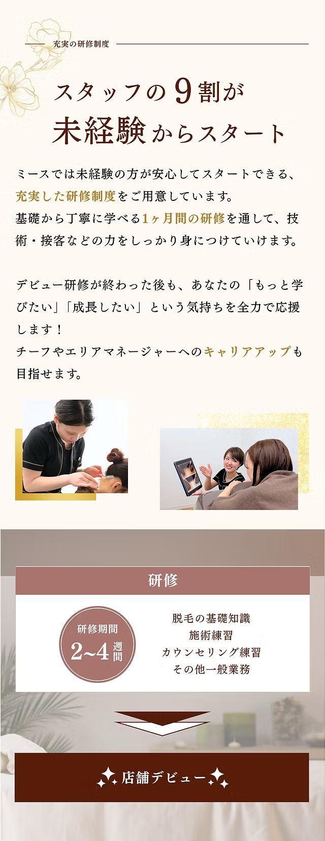 名古屋で美容やうなじ脱毛に関わる仕事をお探しの方へ。こちらでは、うなじ矯正専門店ミース名古屋駅前店の求人・採用情報をご紹介しています。サロンの雰囲気や働くスタッフの声をご覧いただき、採用応募やお問い合わせにお役立てください。