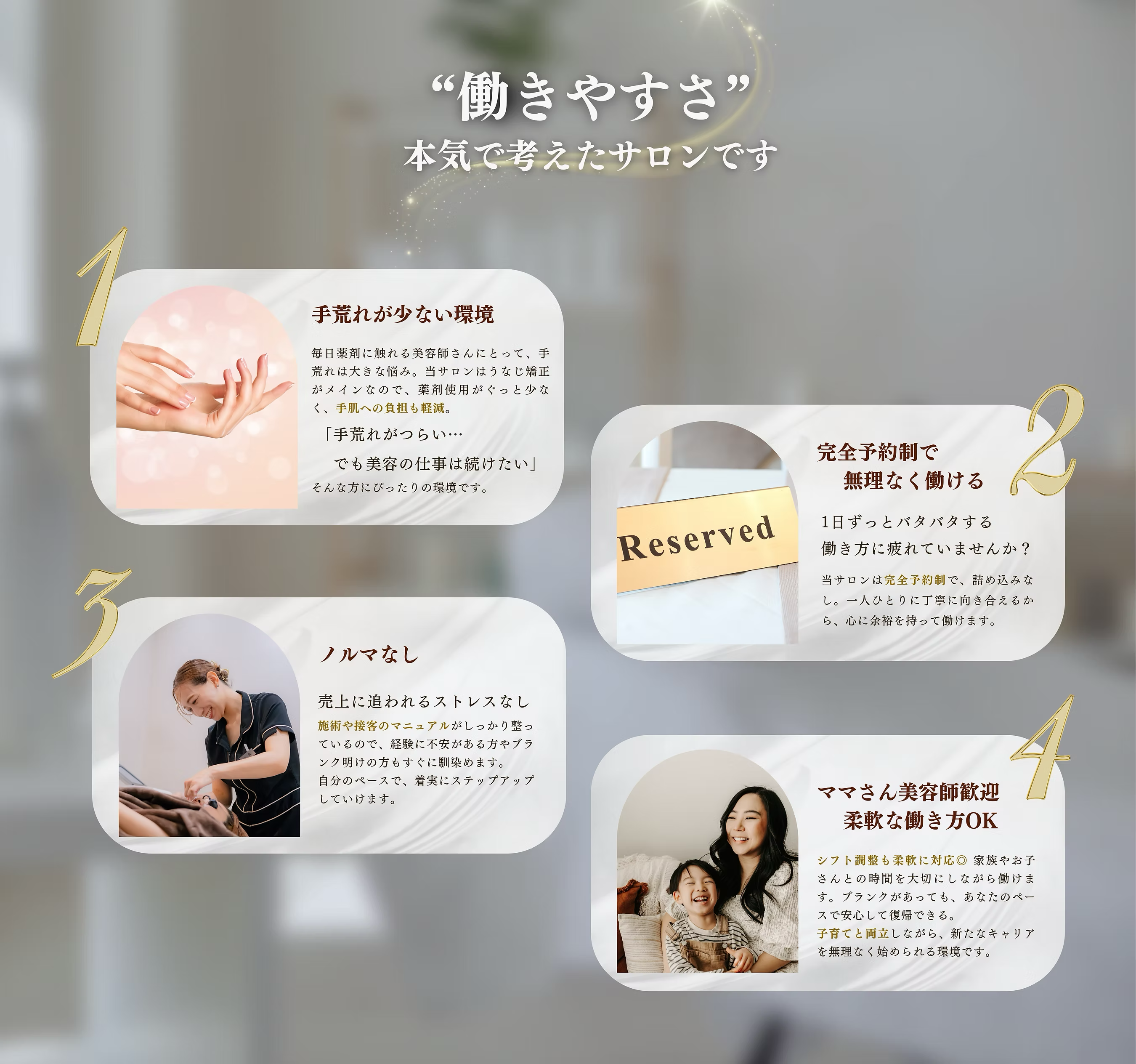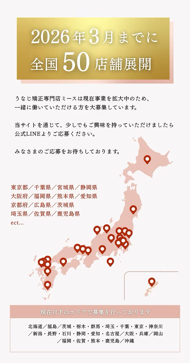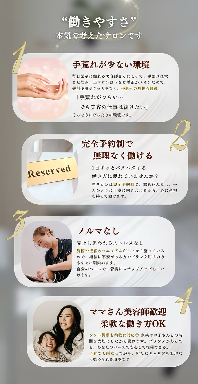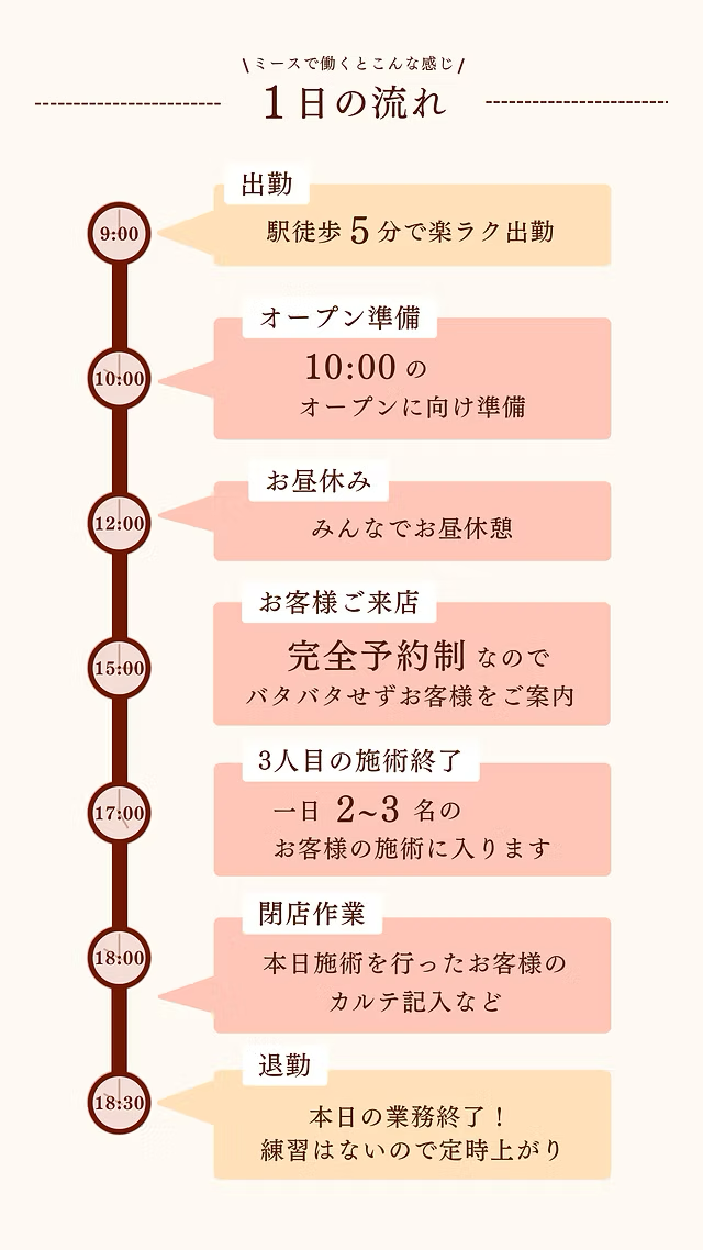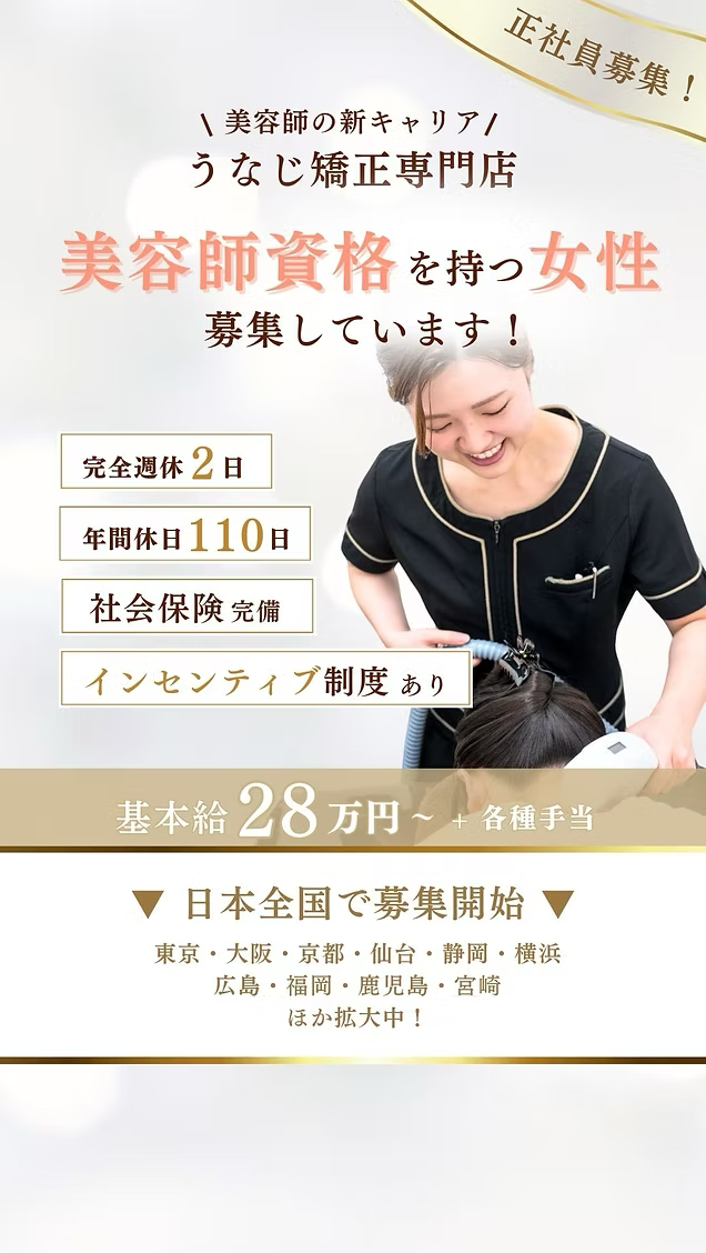 名古屋で美容やうなじ脱毛に関わる仕事をお探しの方へ。こちらでは、うなじ矯正専門店ミース名古屋駅前店の求人・採用情報をご紹介しています。サロンの雰囲気や働くスタッフの声をご覧いただき、採用応募やお問い合わせにお役立てください。